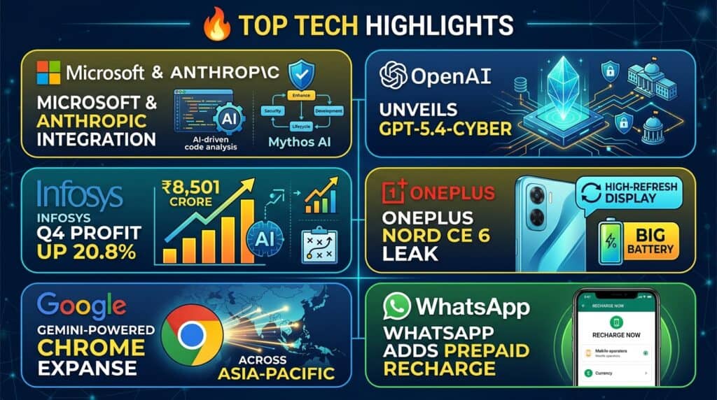 Q1: What are the biggest tech updates today? Today’s highlights include Microsoft integrating Anthropic’s Mythos AI into cybersecurity, OpenAI unveiling GPT‑5.4‑Cyber, Infosys reporting a 20.8% Q4 profit surge, and OnePlus Nord CE 6 leaks.