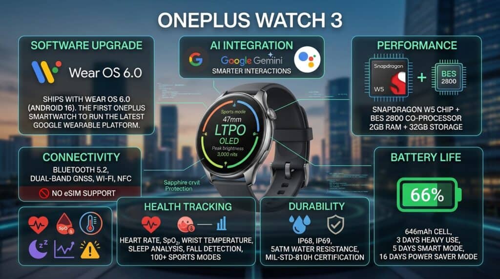 • Software Upgrade: First OnePlus watch to run Wear OS 6.0 (Android 16), layered with OxygenOS Watch 8.